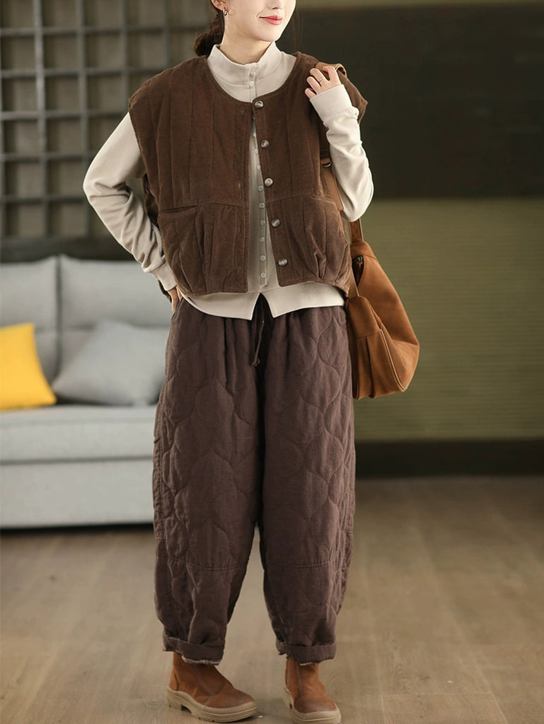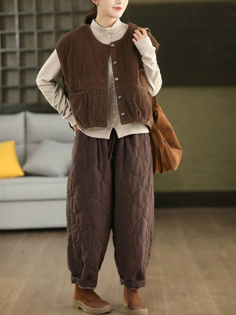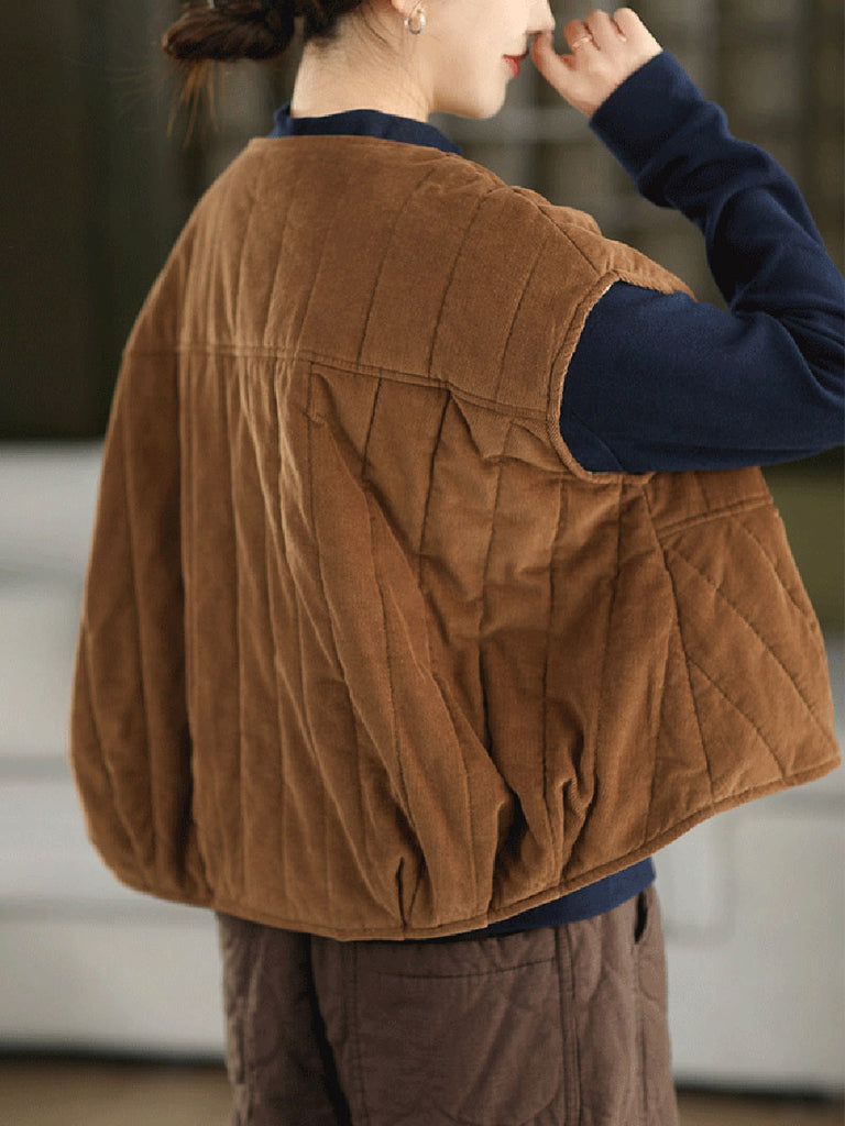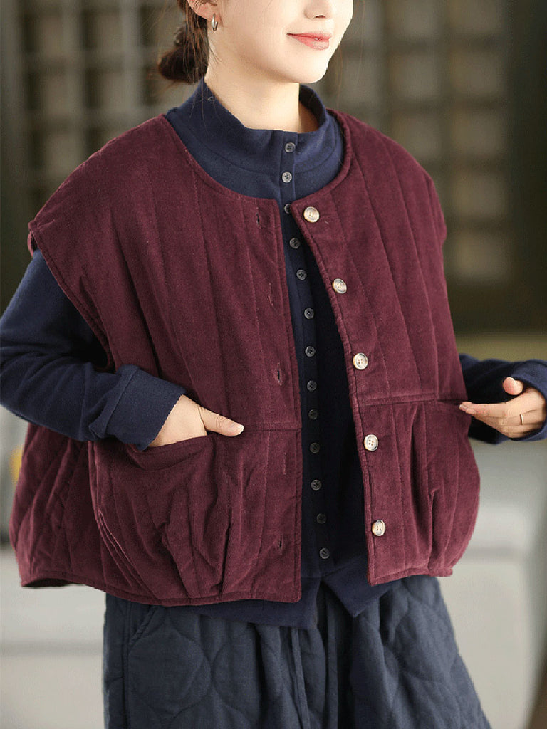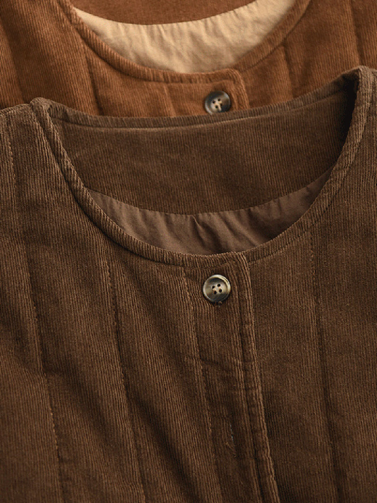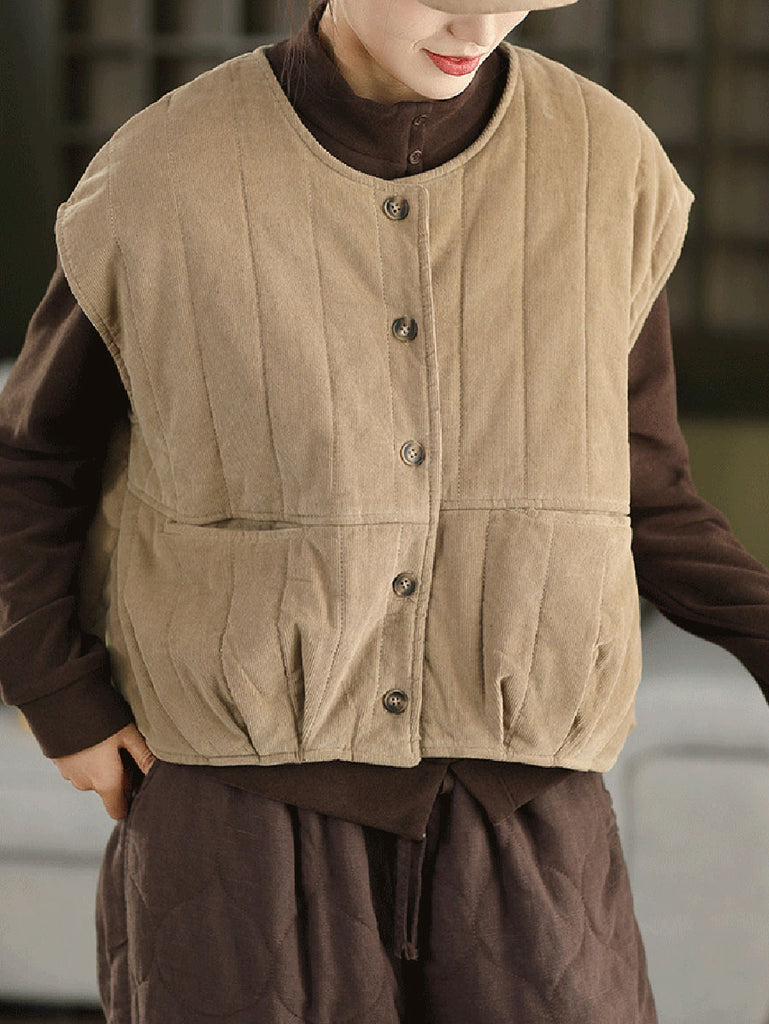 Dámská zimní vesta s čistě barevným výstřihem do O-neck z manšestru a prošívanou podšívkou