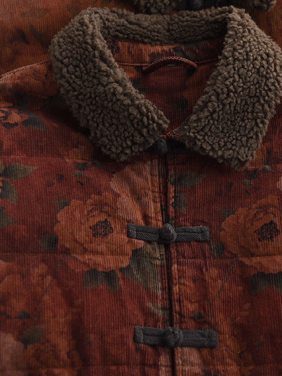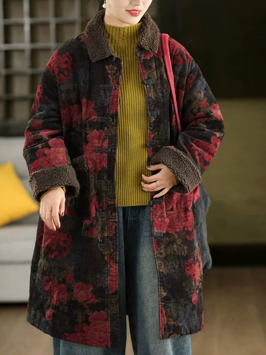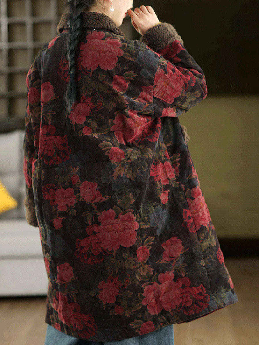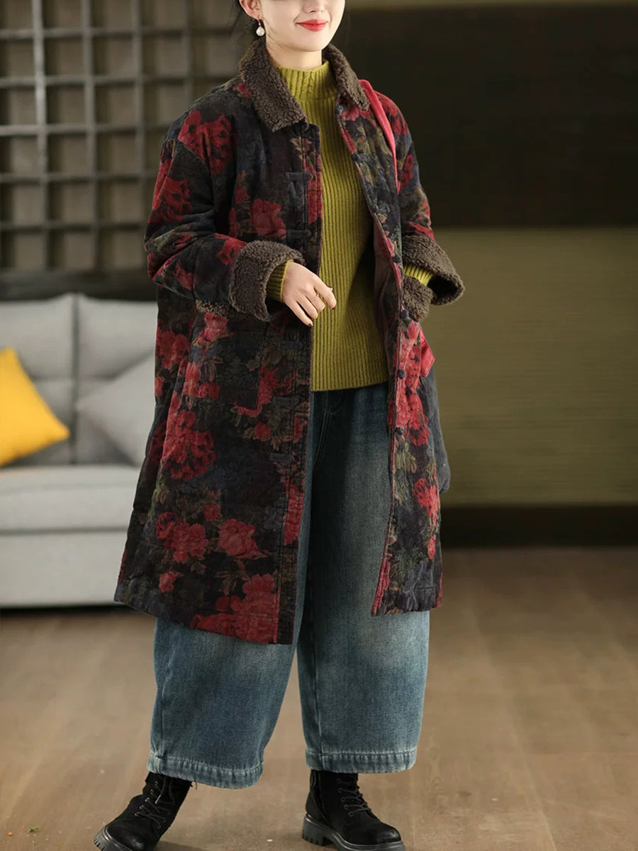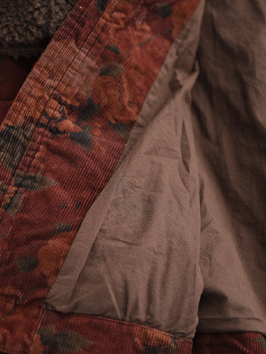Dámský zimní retro květinový fleecový manšestrový kabát