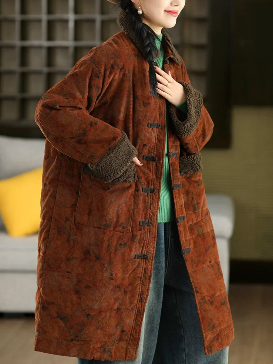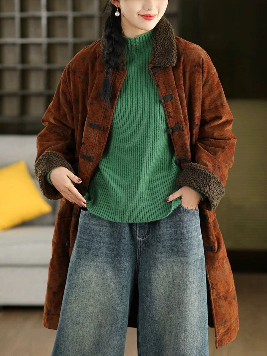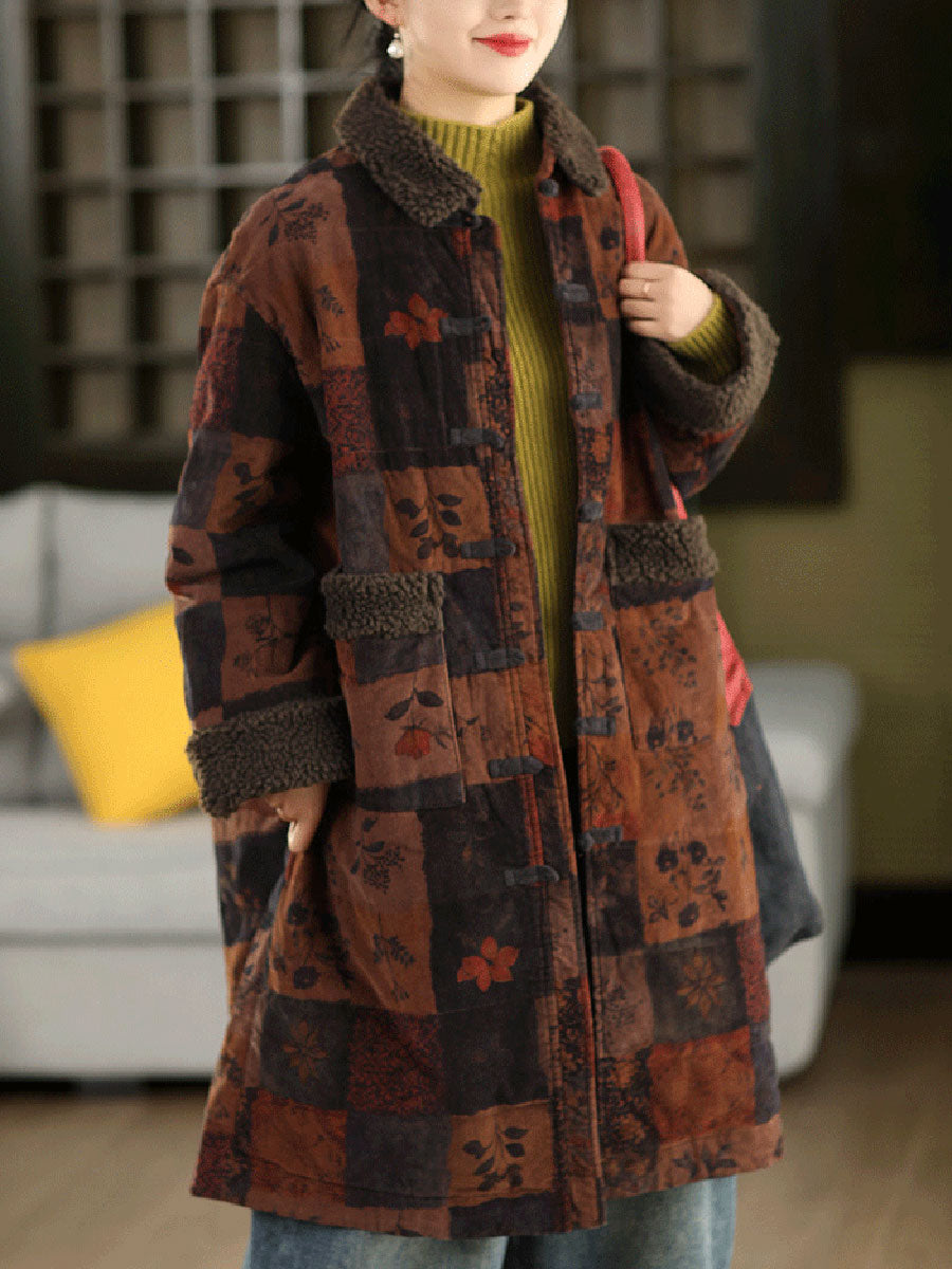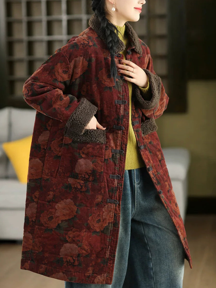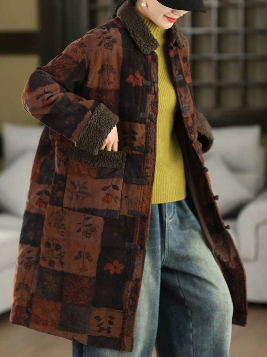 Dámský zimní retro květinový fleecový manšestrový kabát