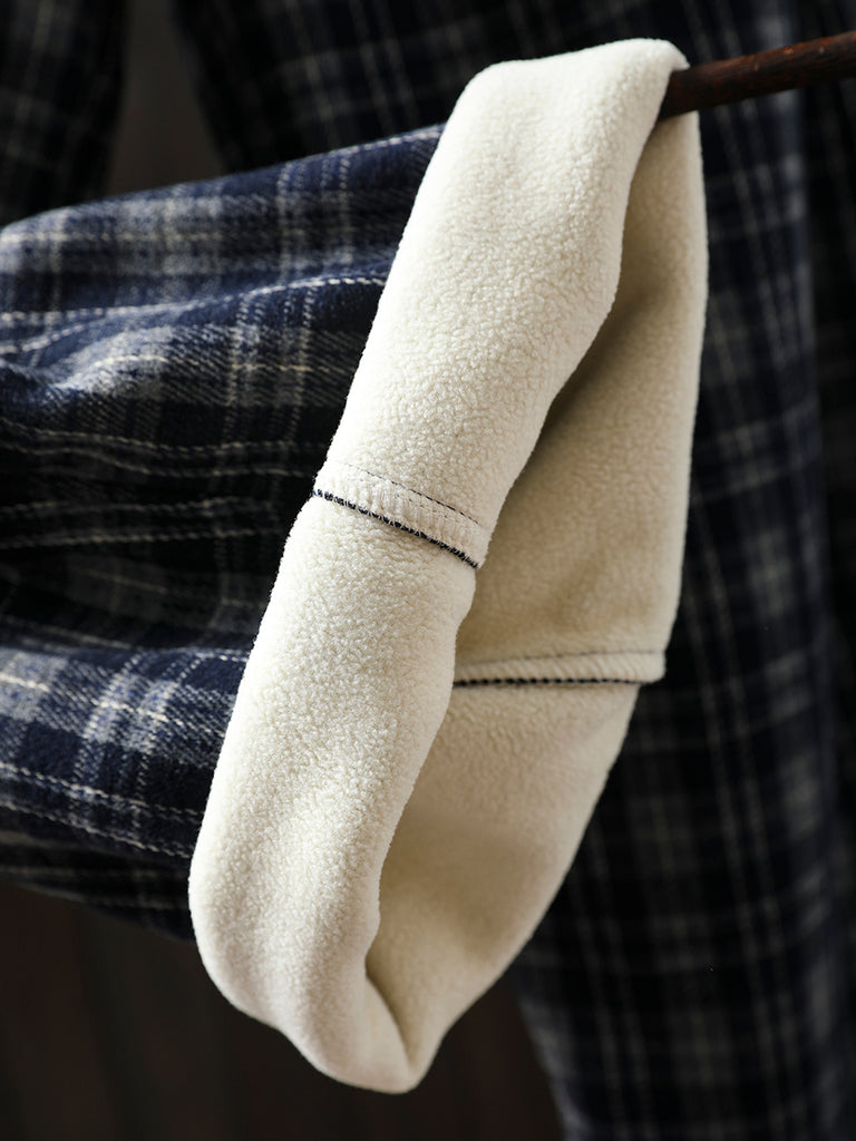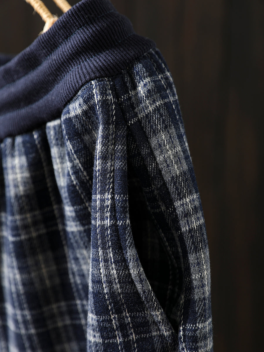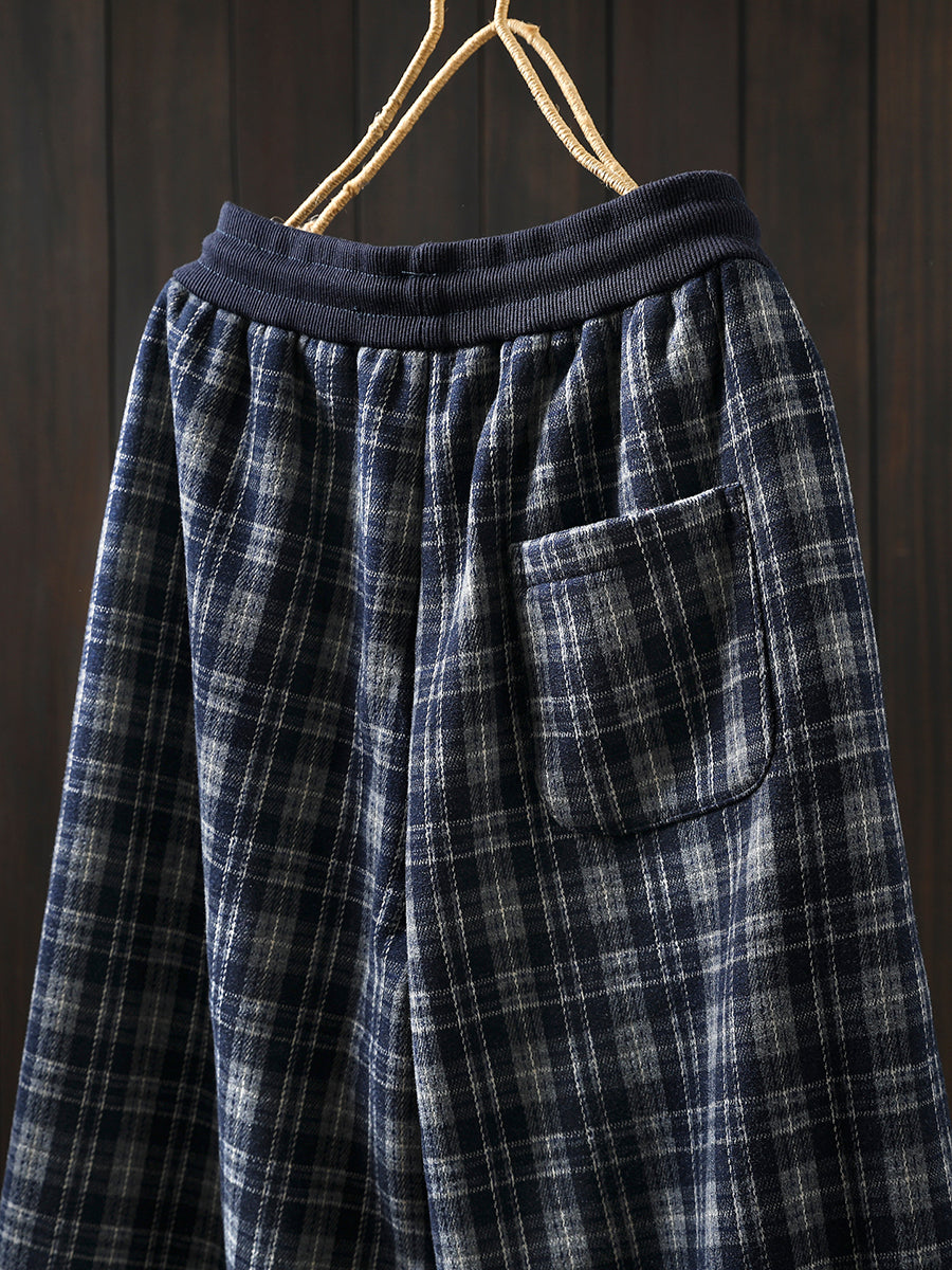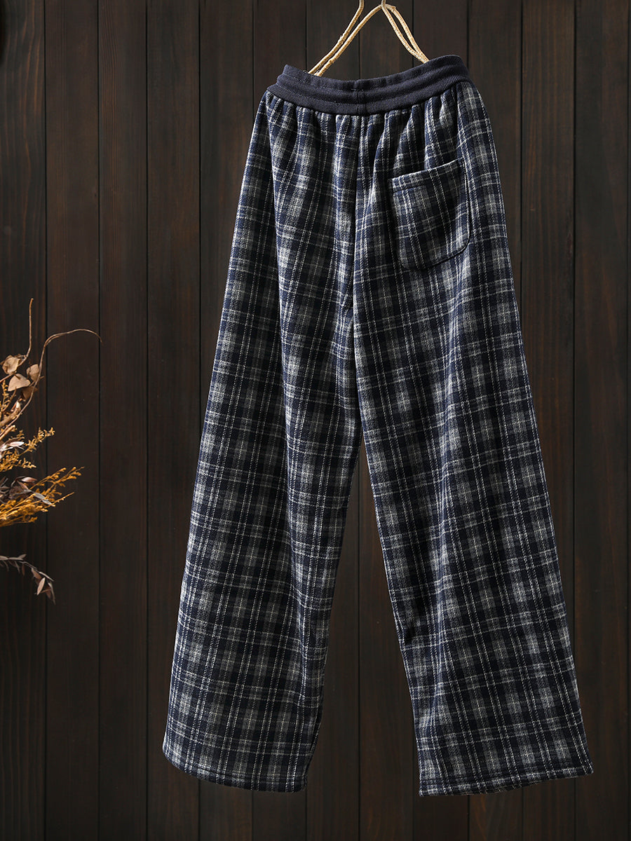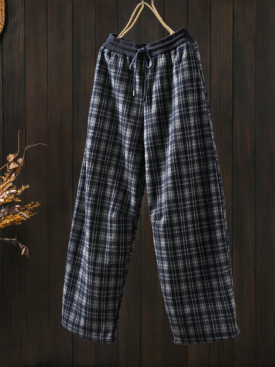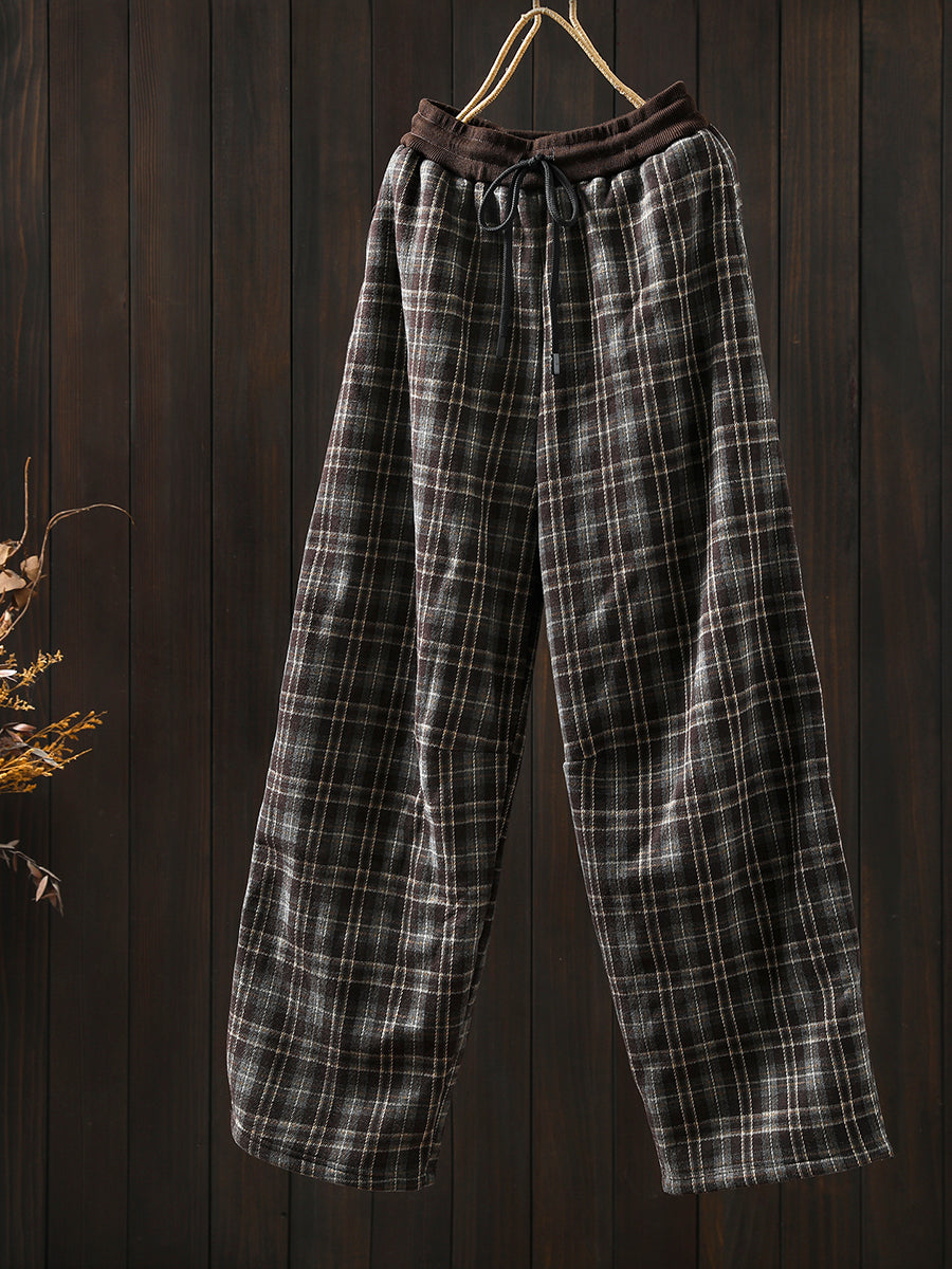 Dámské zimní retro kostkované fleecové kalhoty s širokými nohavicemi