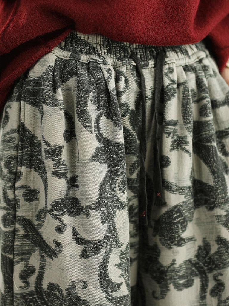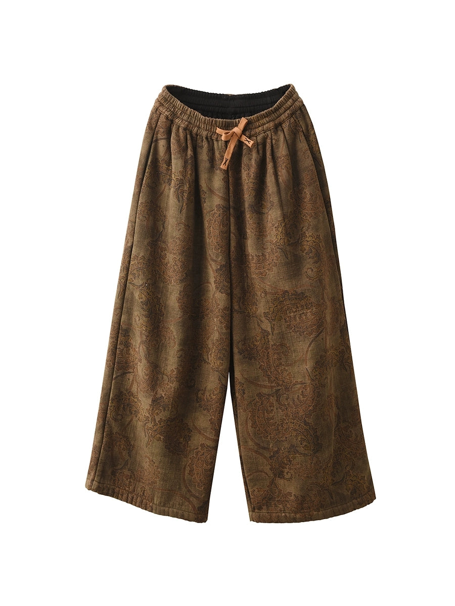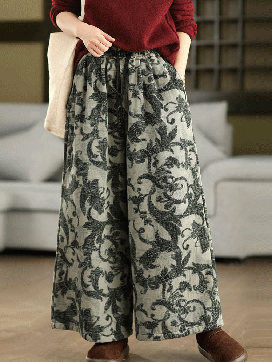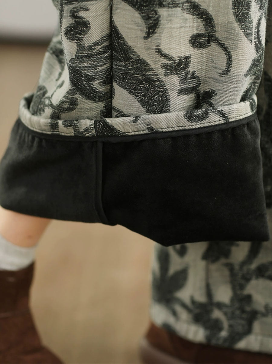 Dámské zimní kalhoty s retro potiskem, fleecovou podšívkou a širokými nohavicemi ze 100% bavlny
