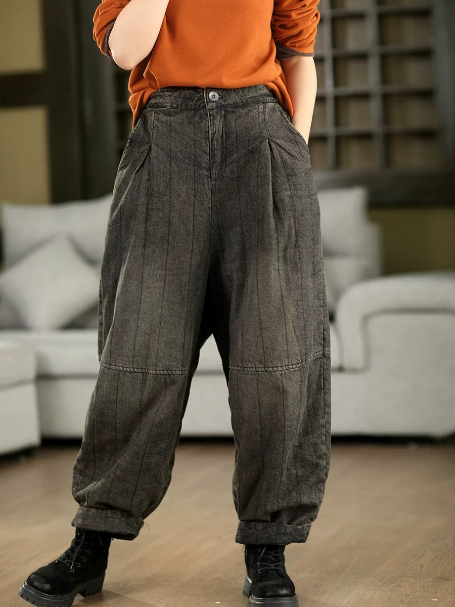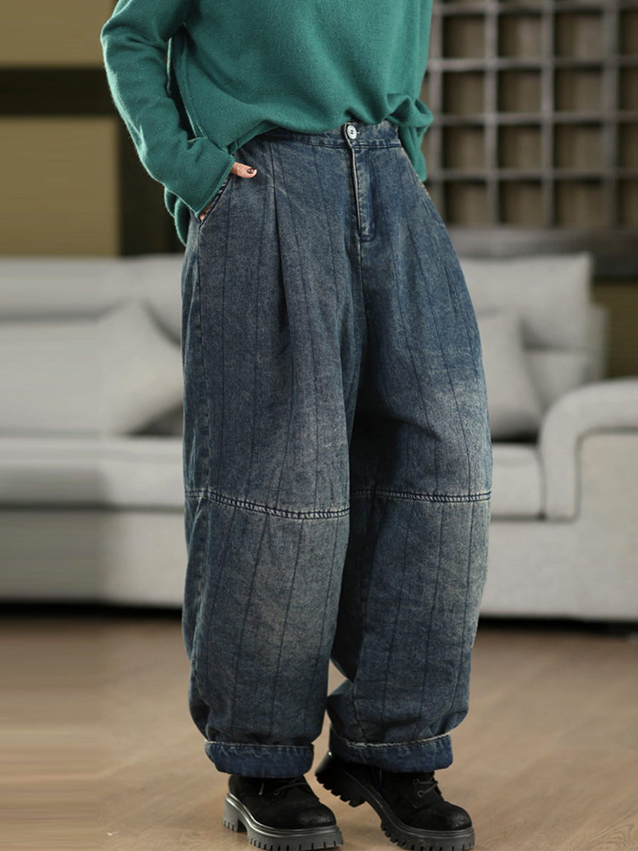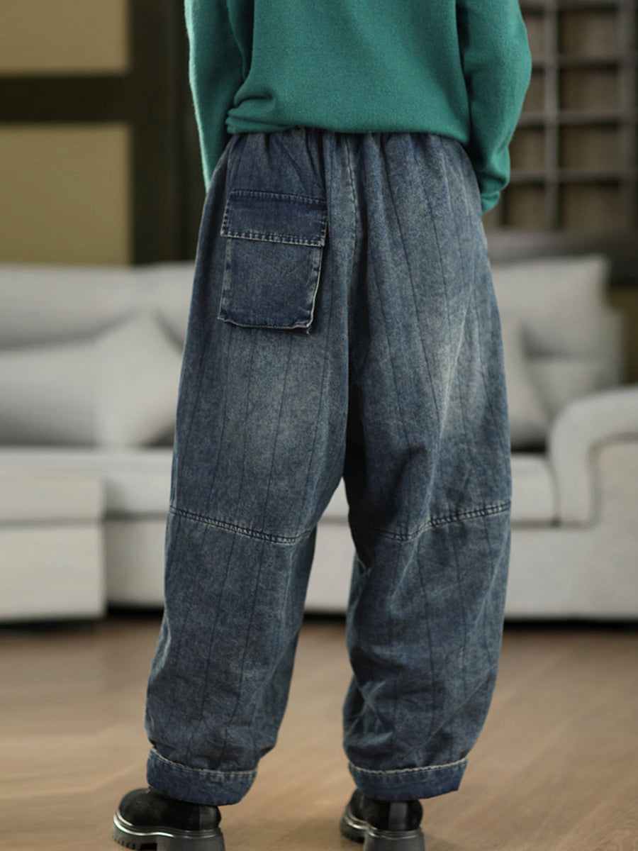 Dámské zimní retro seprané džínové prošívané kalhoty