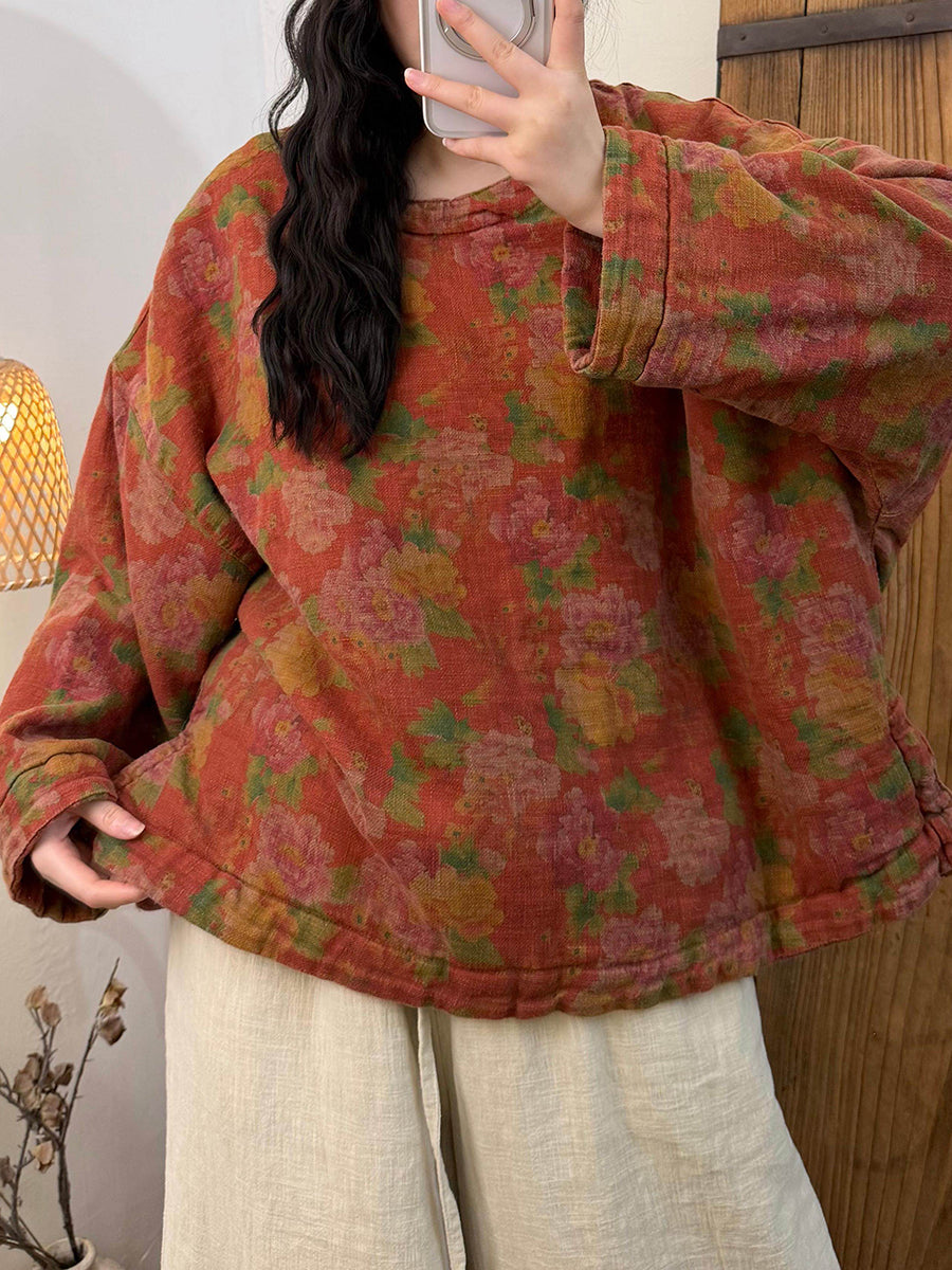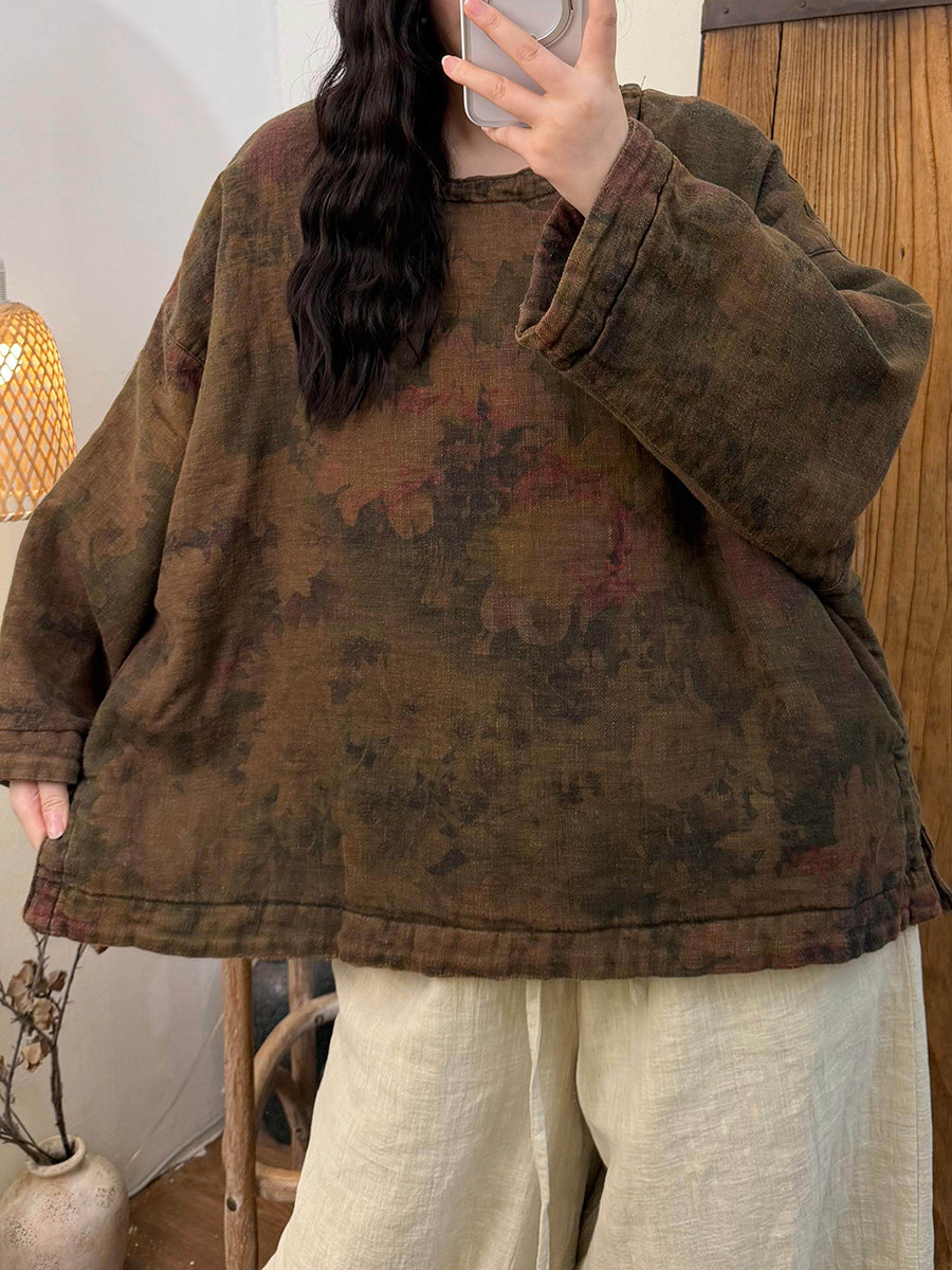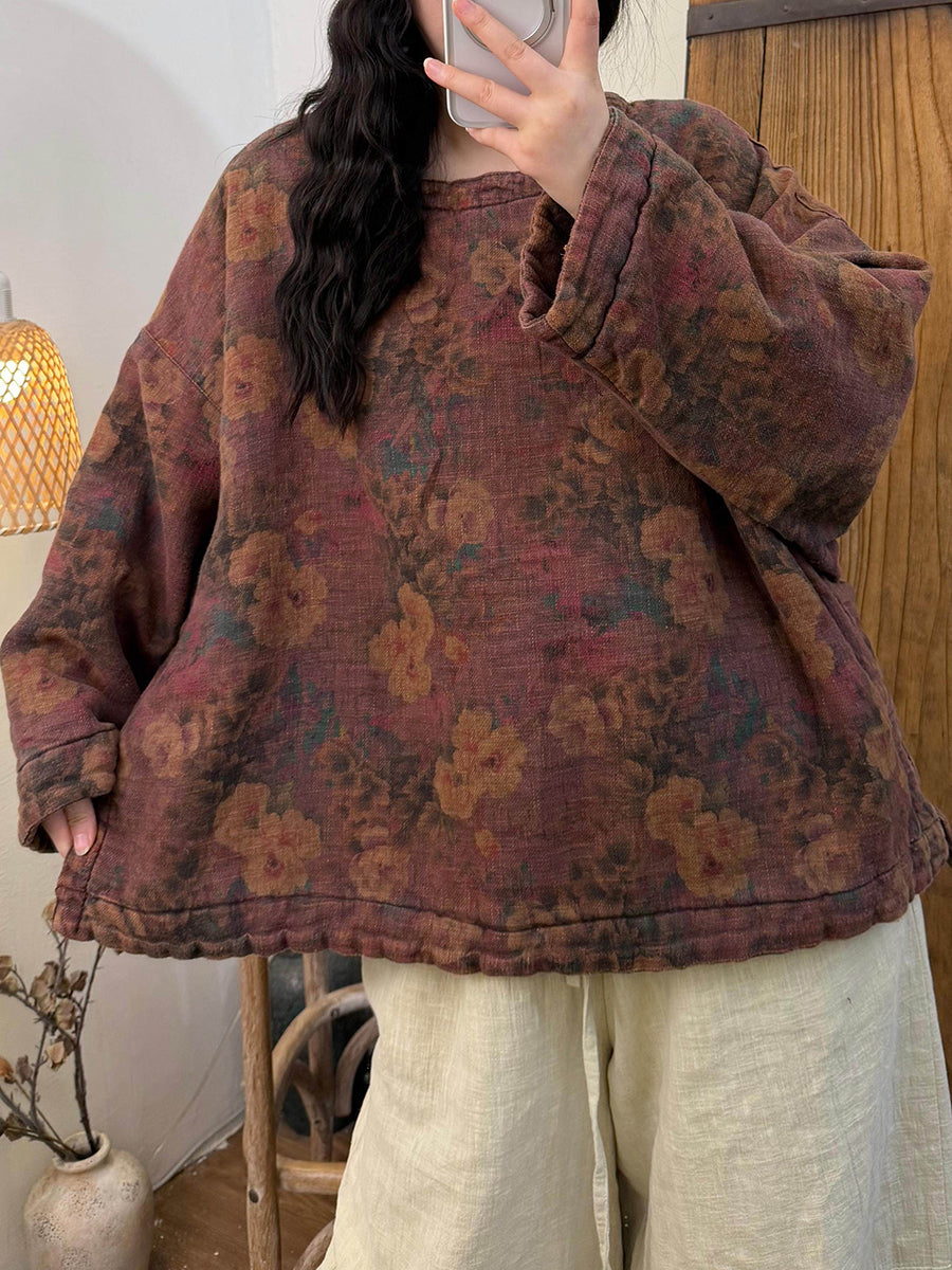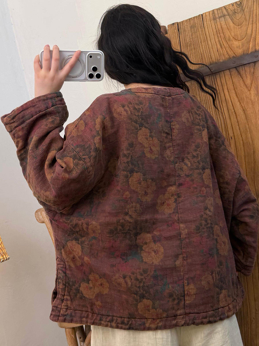 Dámský zimní retro obnošený květinový kabát s výstřihem do O-neck