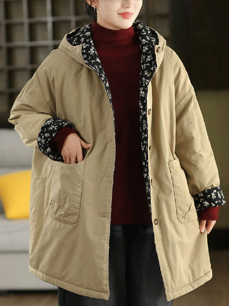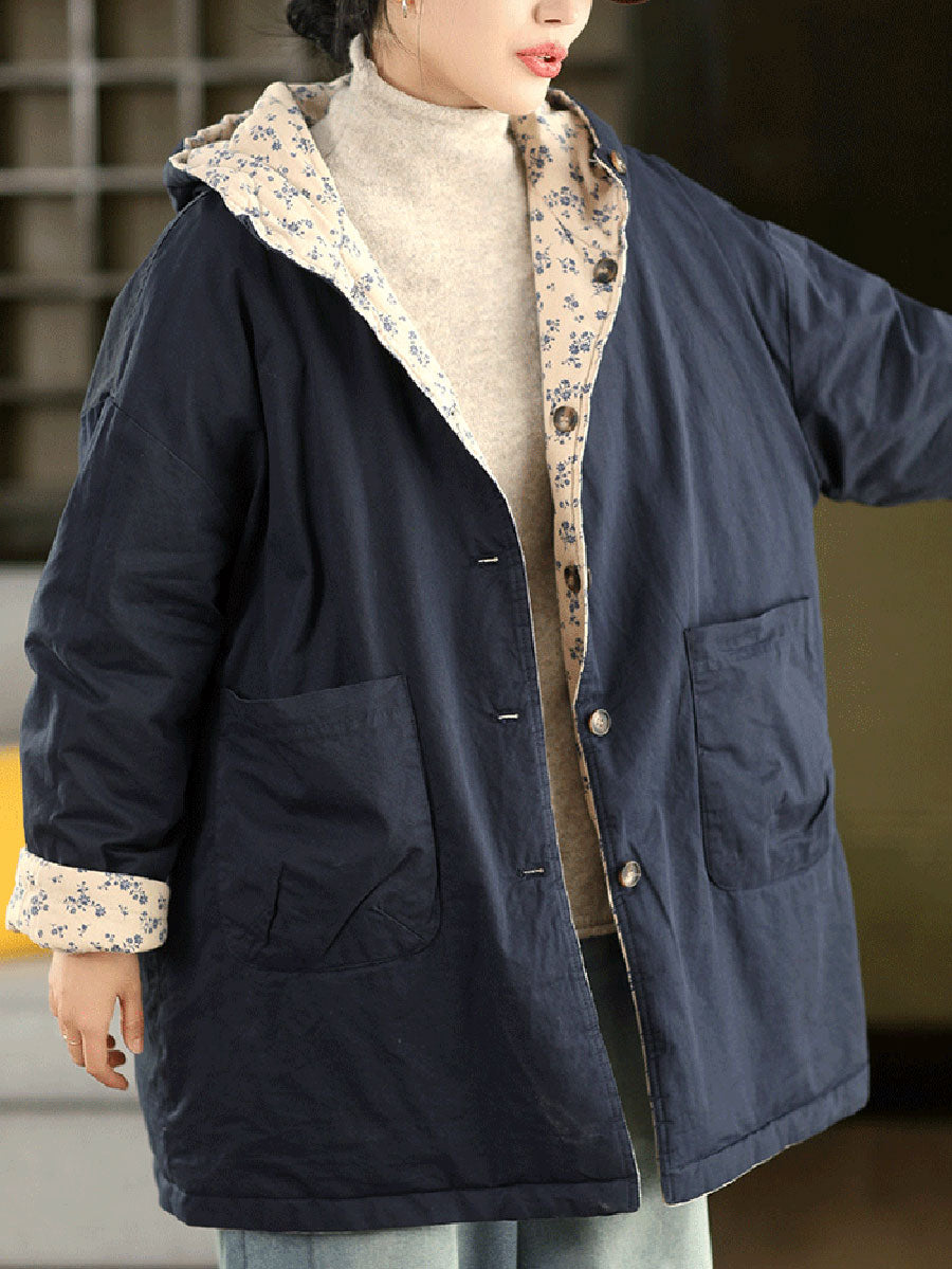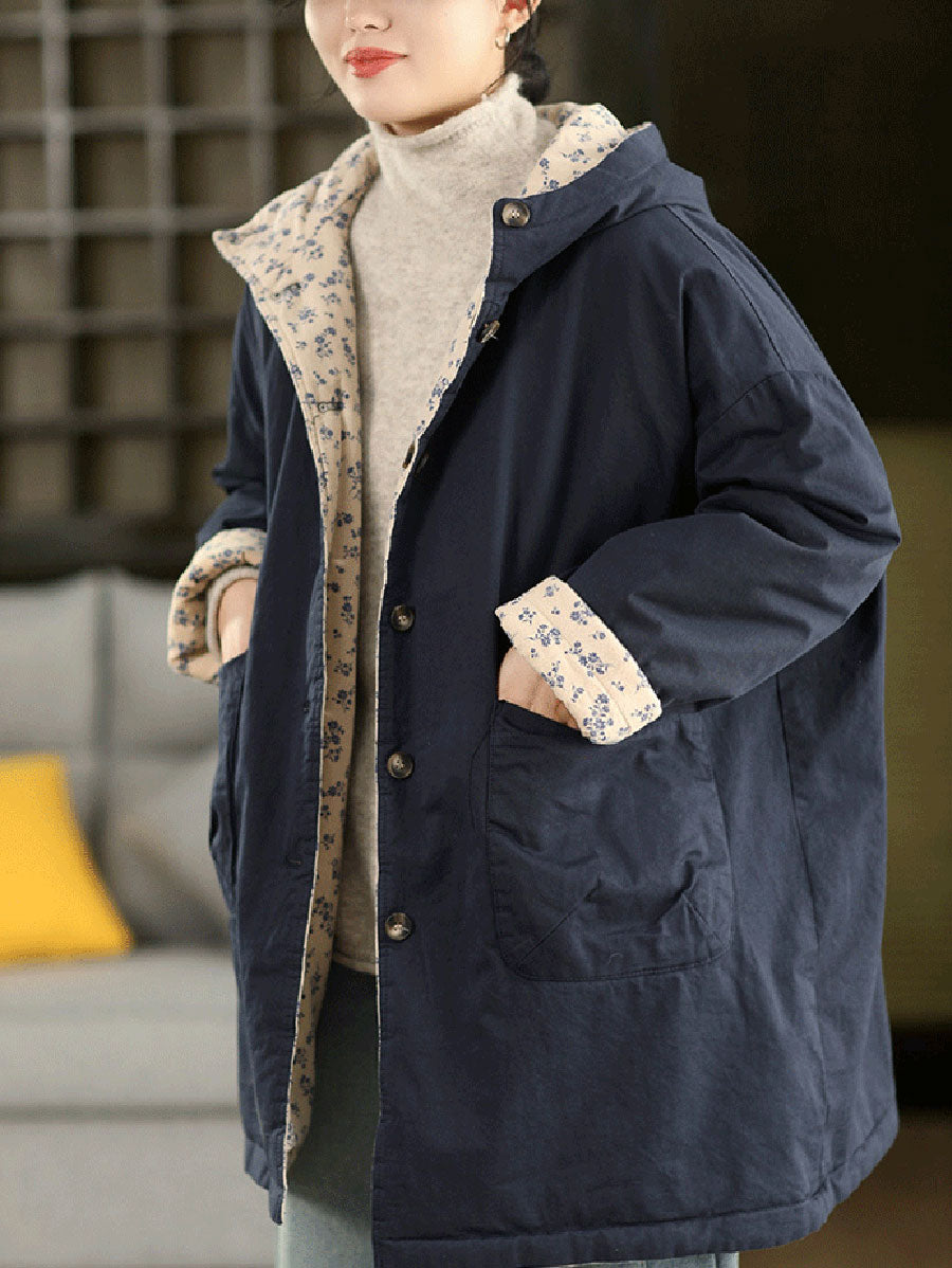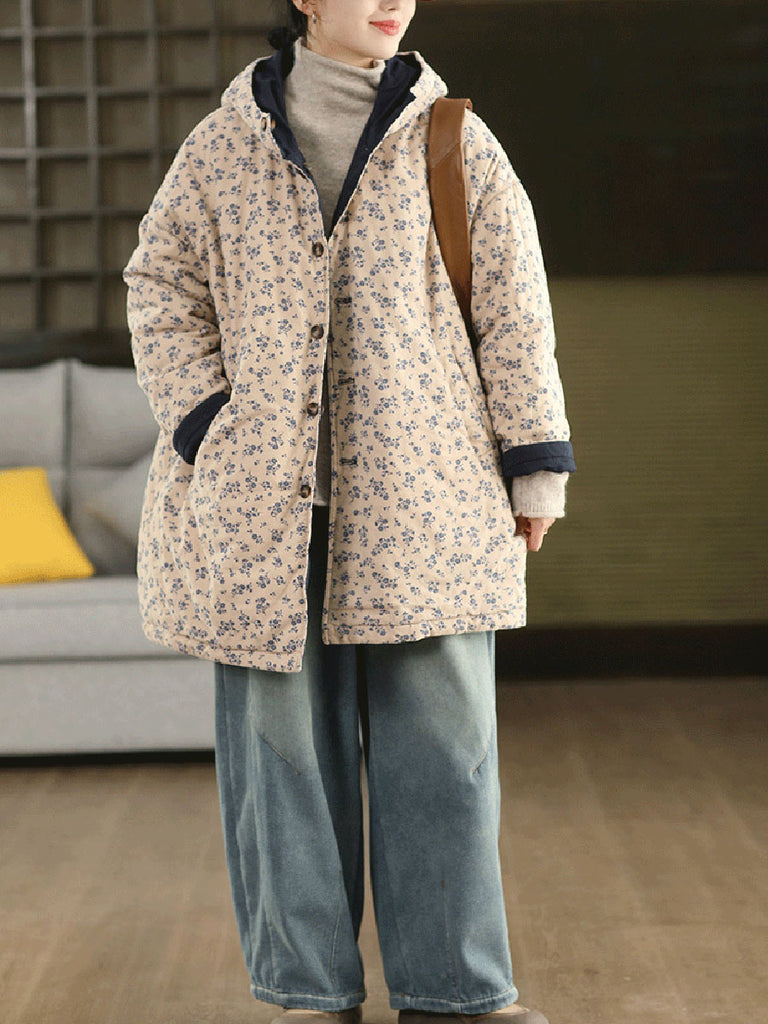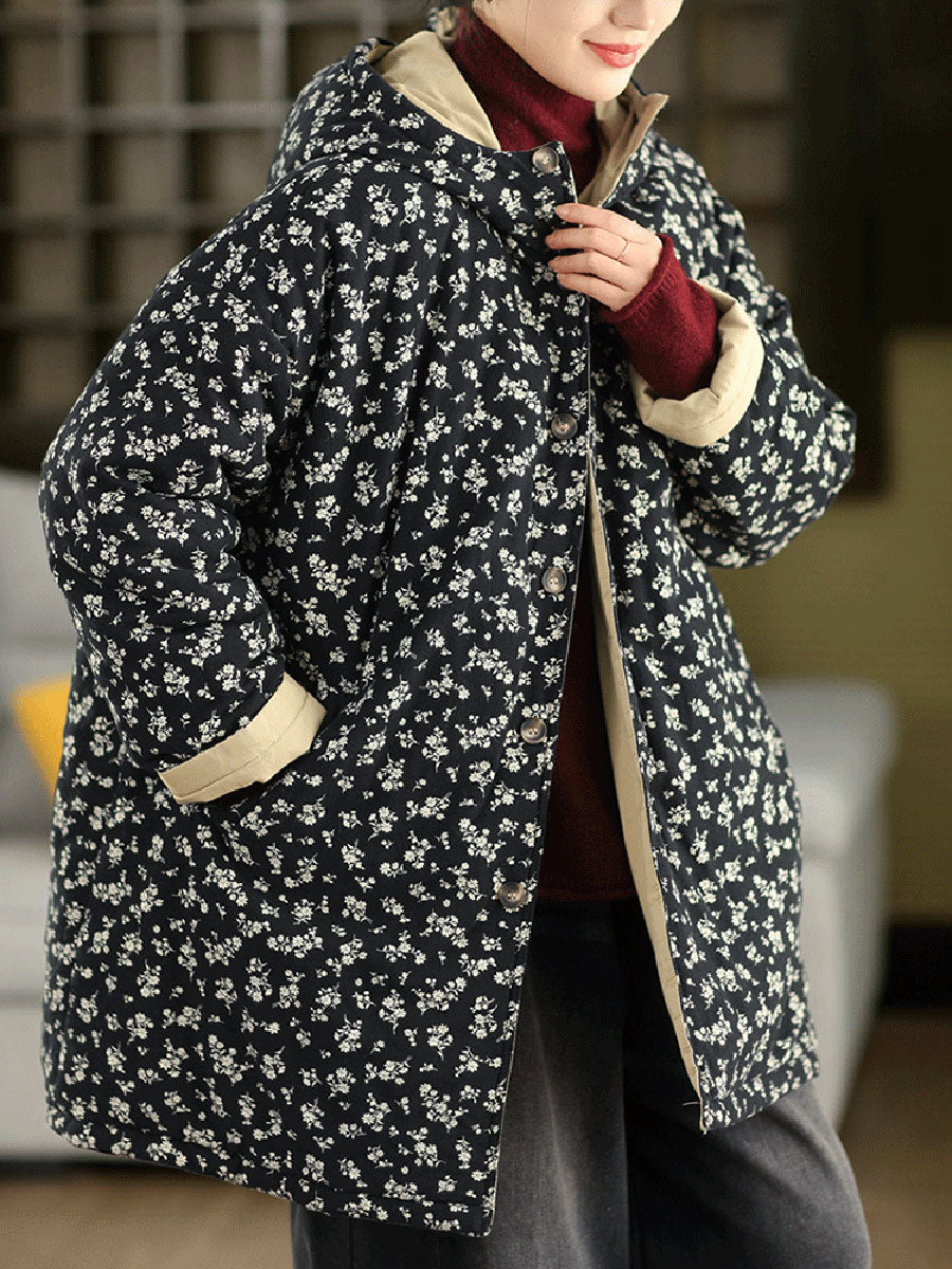 Dámský zimní oboustranný květinový kabát s kapucí ze 100% bavlny