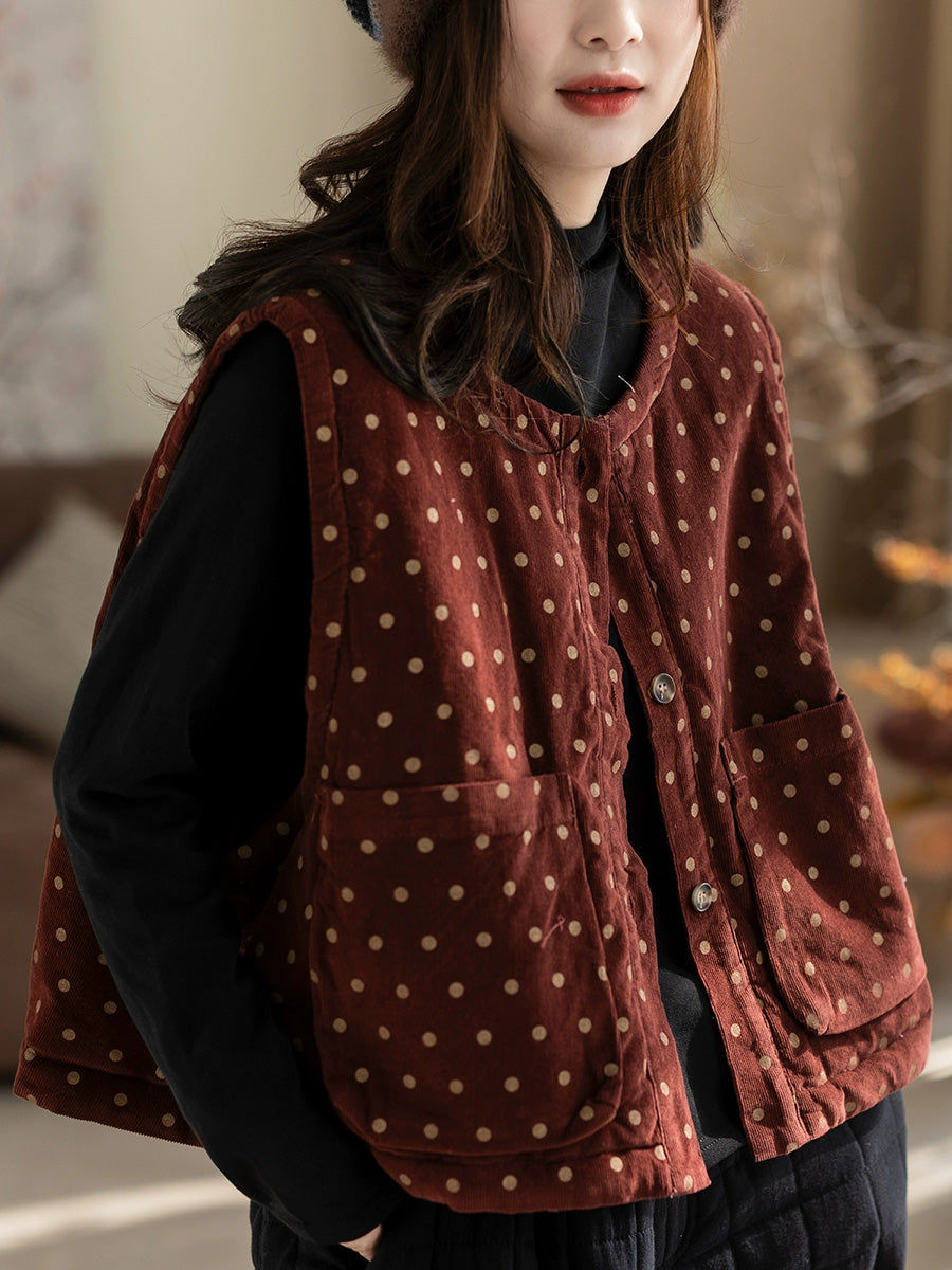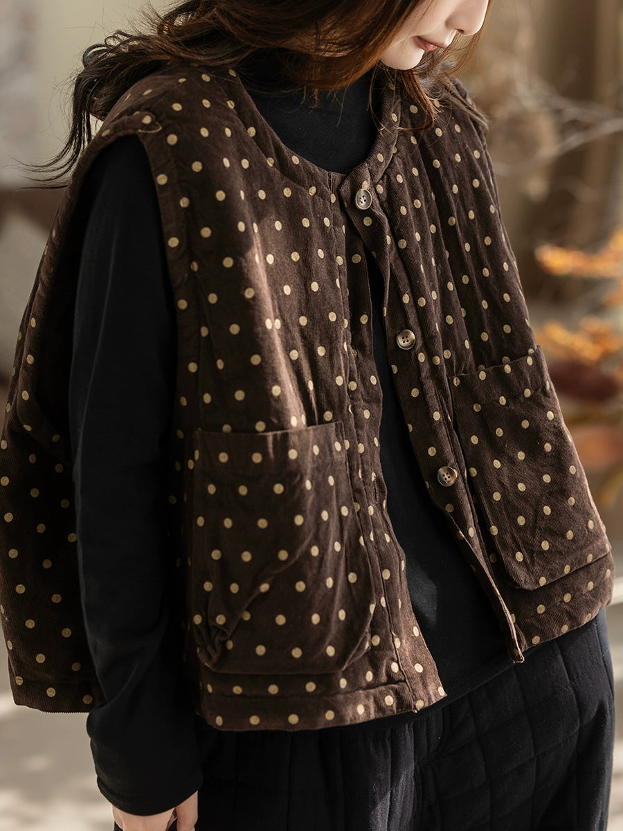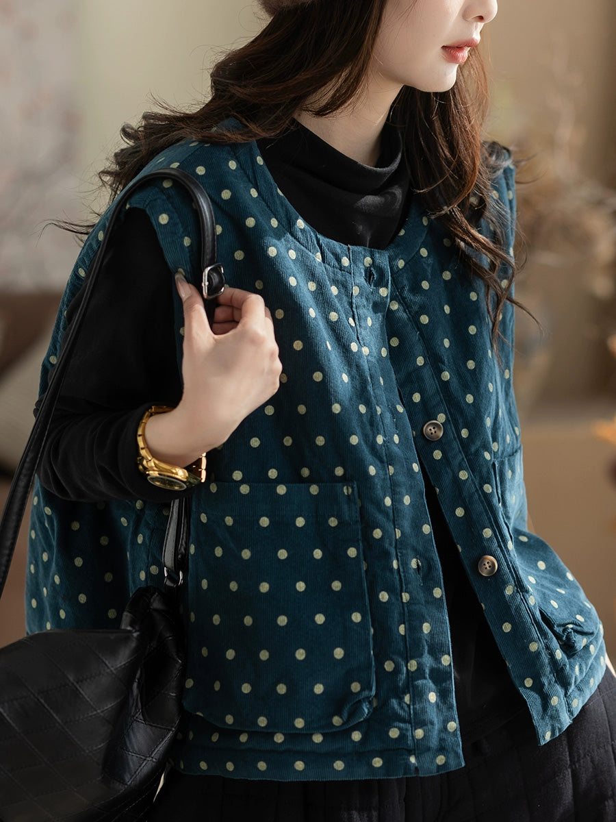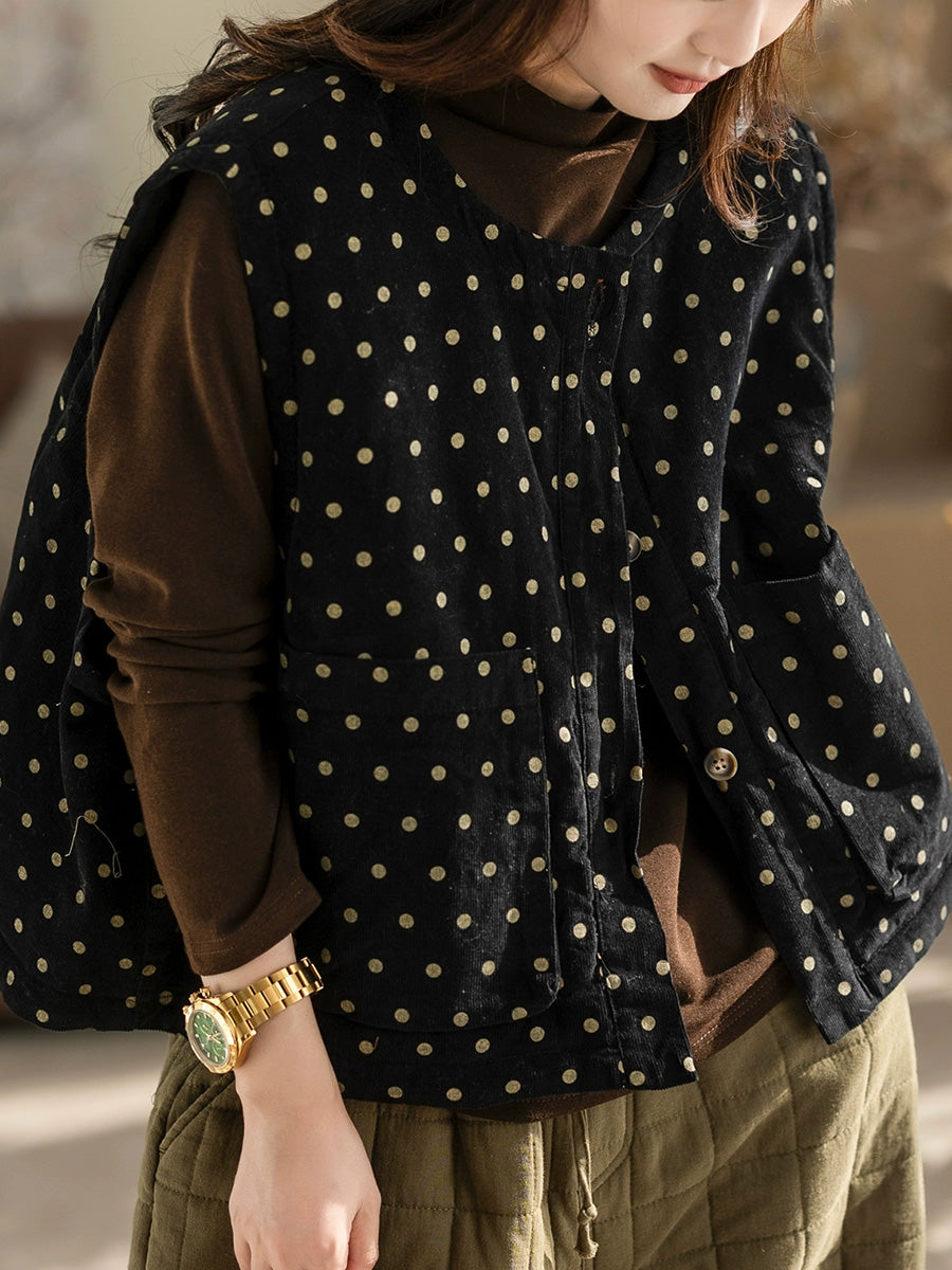Dámská zimní vintage vesta s puntíky a výstřihem do O-neck