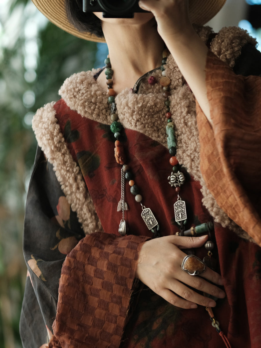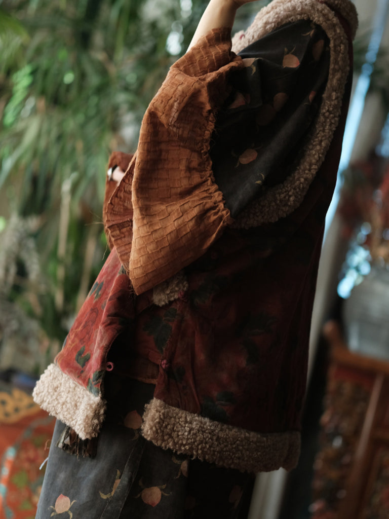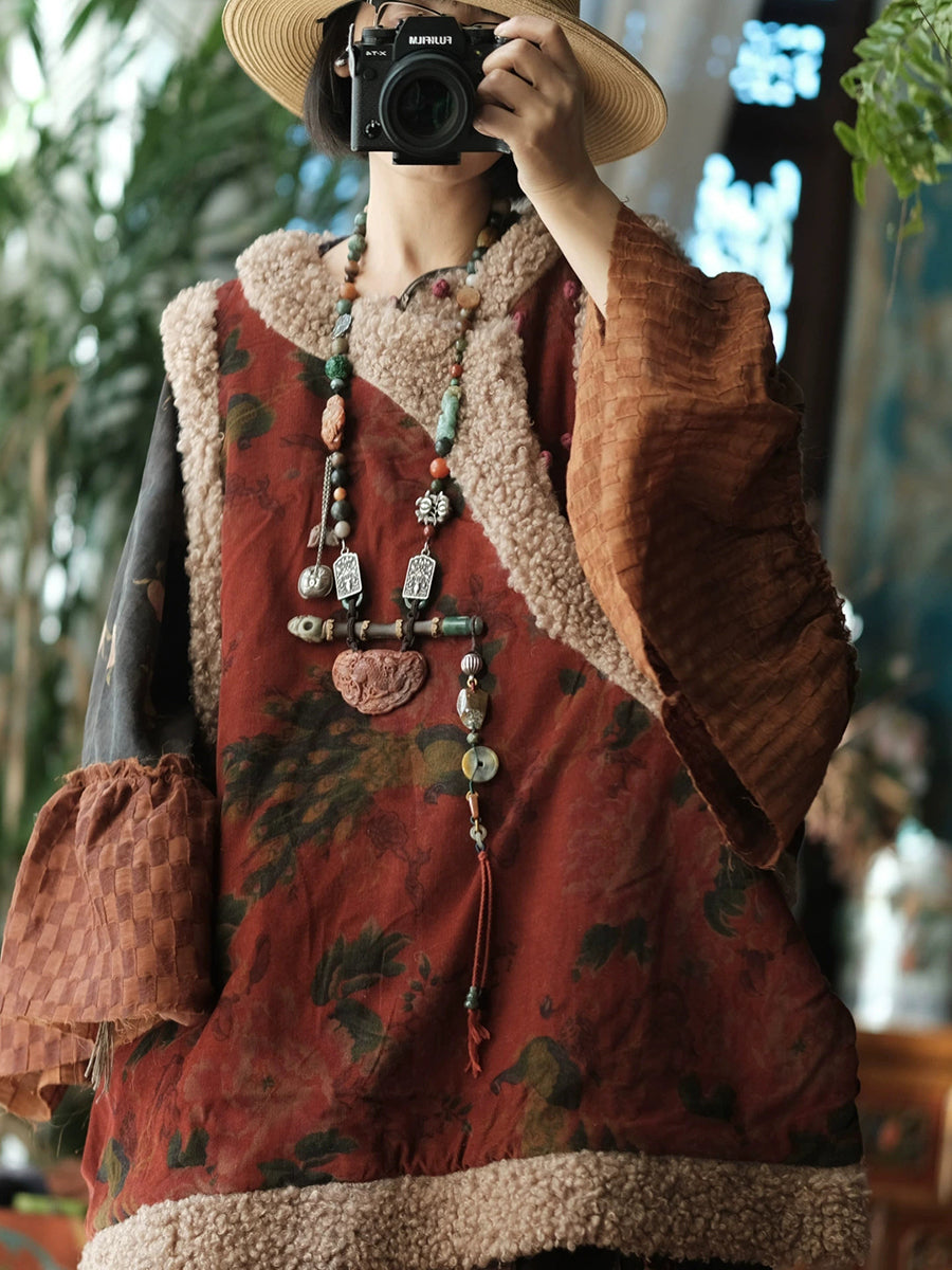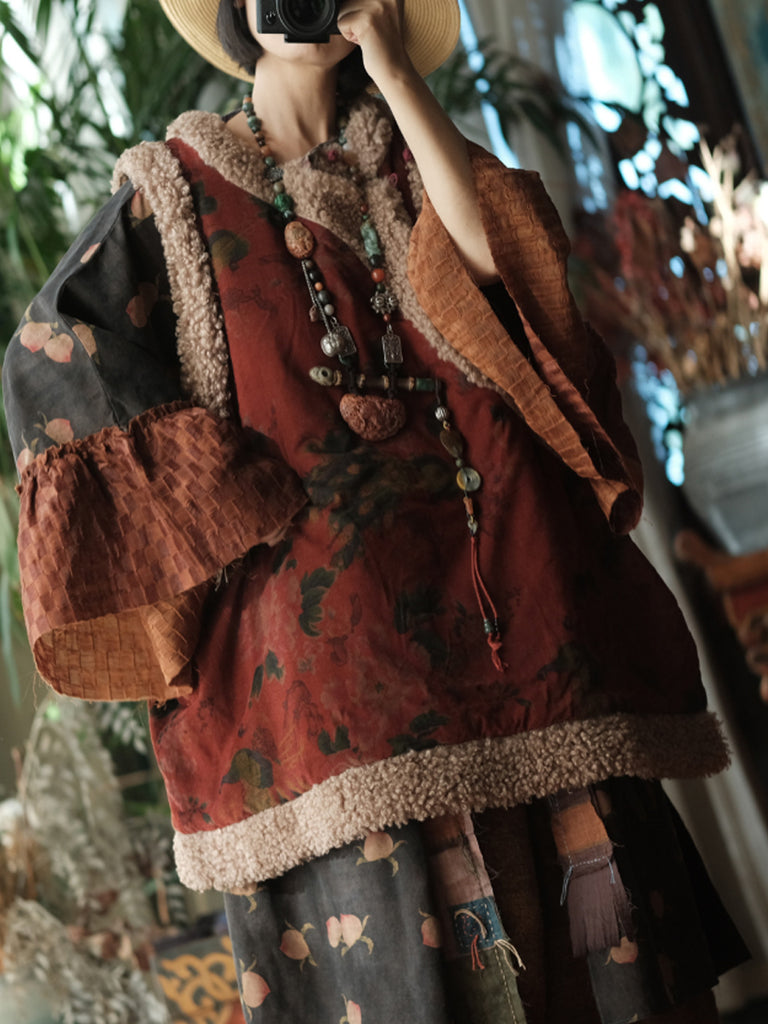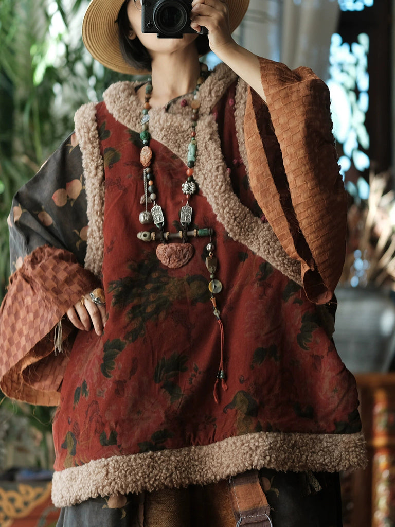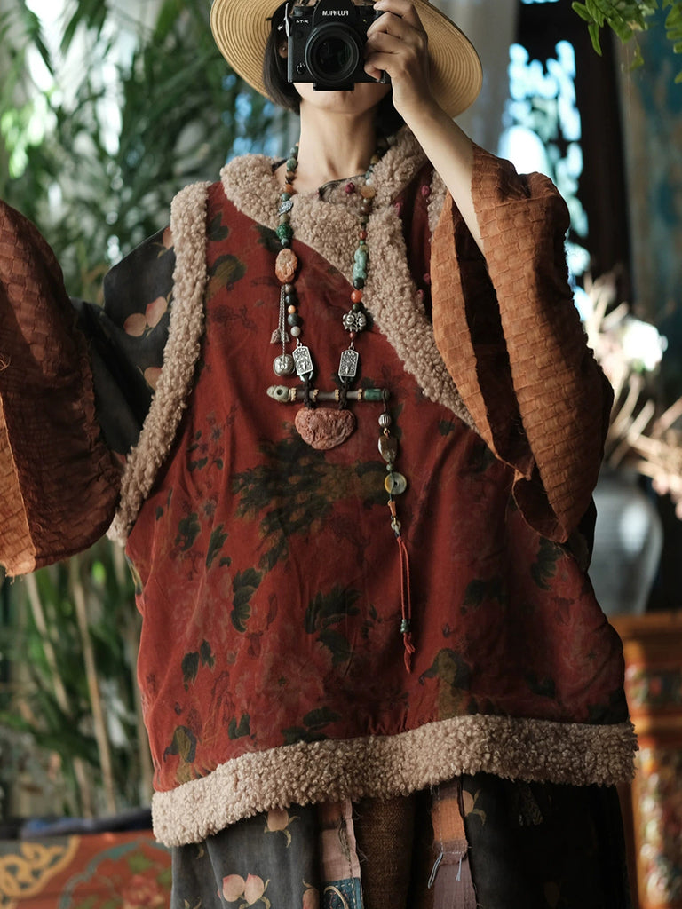 Dámská zimní vintage květinová fleecová prošívaná vesta