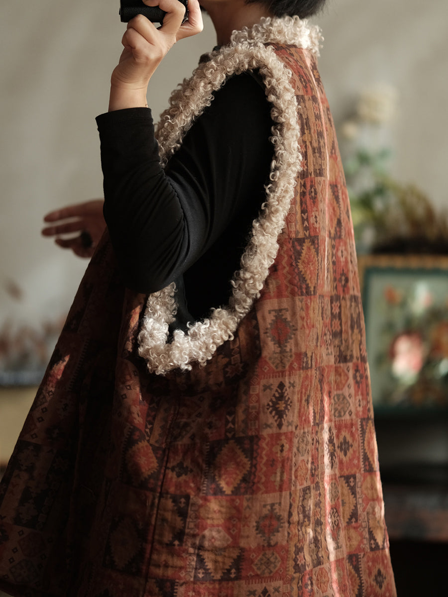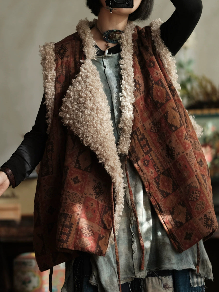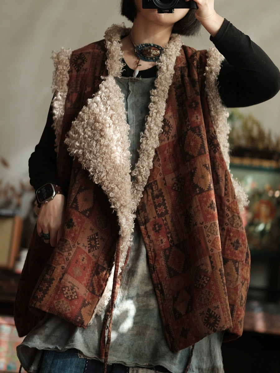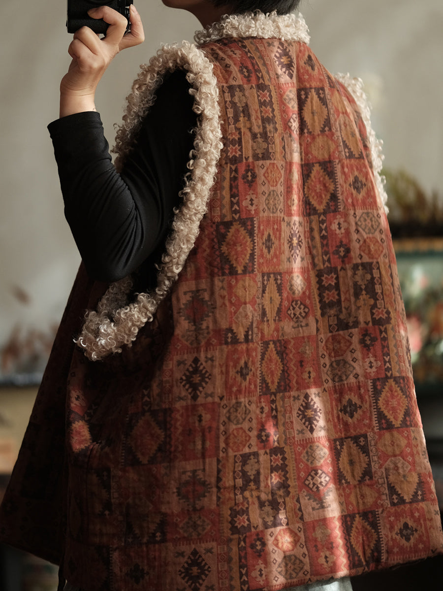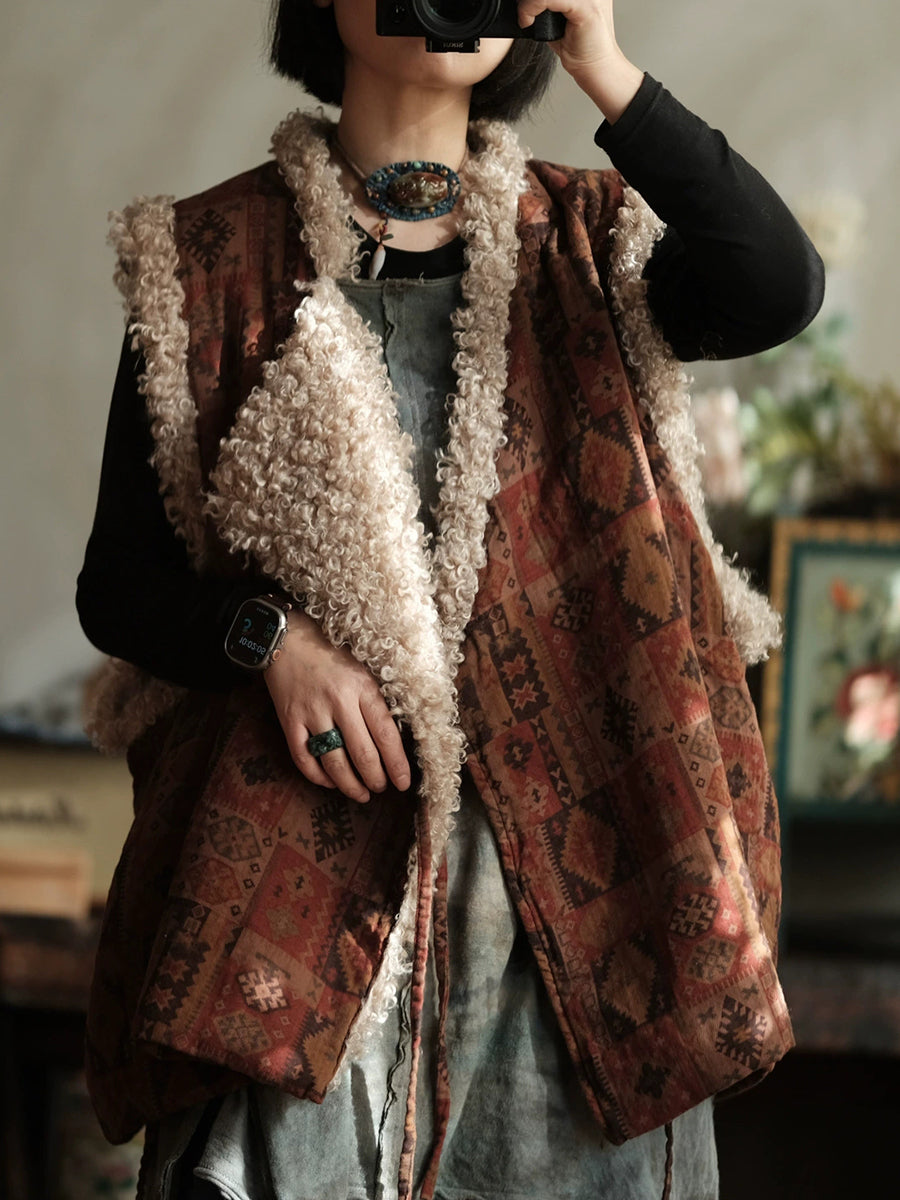 Dámská zimní vintage patchworková fleecová vesta s výstřihem do V